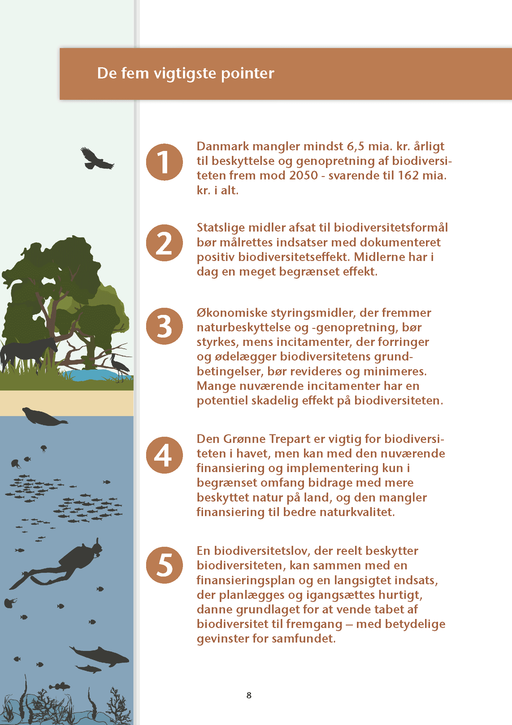 - Danmark mangler mindst 6,5 mia. kr. årligt til beskyttelse og genopretning af biodiversiteten frem mod 2050 – svarende til 162 mia. kr. i alt.